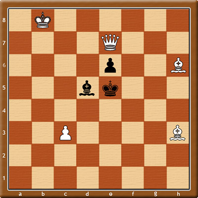Juříček S. (Vsetín) #2 (C+) 289 Kutnohorský deník 9.8.2003 A040 / Kb8,De7,Sh3,Sh6,Pc3 - Ke5,Sd5,Pe6 (5+3)mat 2. tahem řešení: ZDE